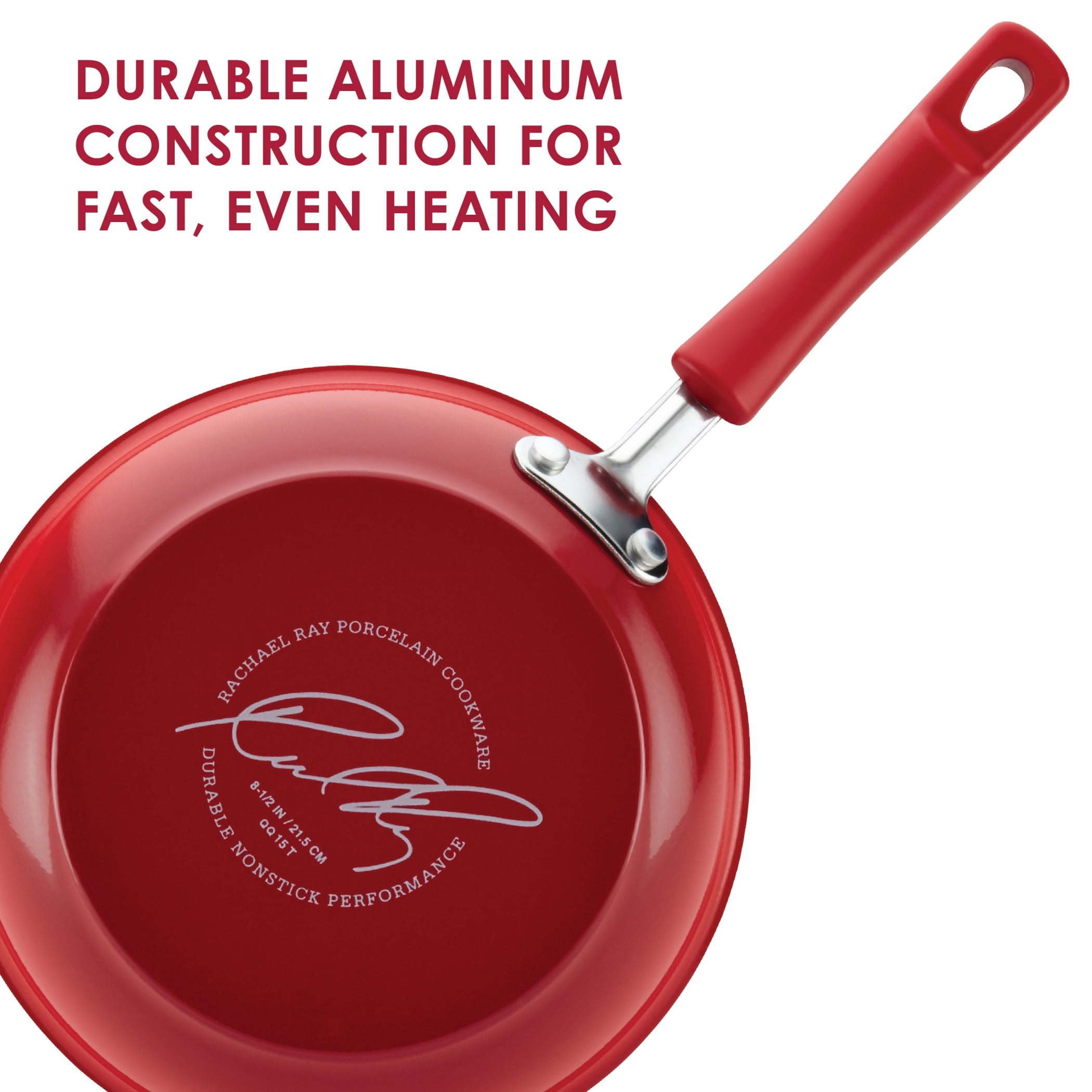 Cooks new and experienced alike will appreciate the essential pieces included in the Classic Brights Hard Enamel Nonstick 15-Piece Cookware Set with bakeware and kitchen tools. Whether your cooking tasks are simmering and searing or browning and baking, cookware gets the kitchen set. From the reliable cooking performance to the fun, contemporary colors and durable materials, the pots and pans in this collection can handle everyone's favorite dishes, and then some. Sturdy aluminum construction promotes even heating, helping to reduce hot spots that can burn foods, and the bold two-tone enamel cookware exteriors show plenty of stylish kitchen personality. hard enamel cookware features durable nonstick interiors that provide beautiful food release and make cleanup snappy. Oven safe to 350F, the cookware's comfortable grippy handles are double riveted for extra strength, and the shatter-resistant glass lids lock in heat and moisture. The cookware comes with two nonstick round cake pans that sport a solid pop of coordinating color and extra-large handles, and are oven safe to 450F. And the cooking tools included – two nonstick-suitable cooking spoons and Rach's clever Veg-A-Peel fruit and vegetable peeler – are smartly-designed so your cooking really cooks! Make, bake and share favorite foods and show off a lot of personality with the bold and contemporary Classic Brights Hard Enamel Nonstick 15-Piece Cookware Set.Pots and pans feature sturdy aluminum construction for quick, even heating; medium nonstick bakeware made from warp-resistant steelThe cookware set's two-tone exterior color makes a bold style statement; long-lasting nonstick interiors provide easy food release and cleanup