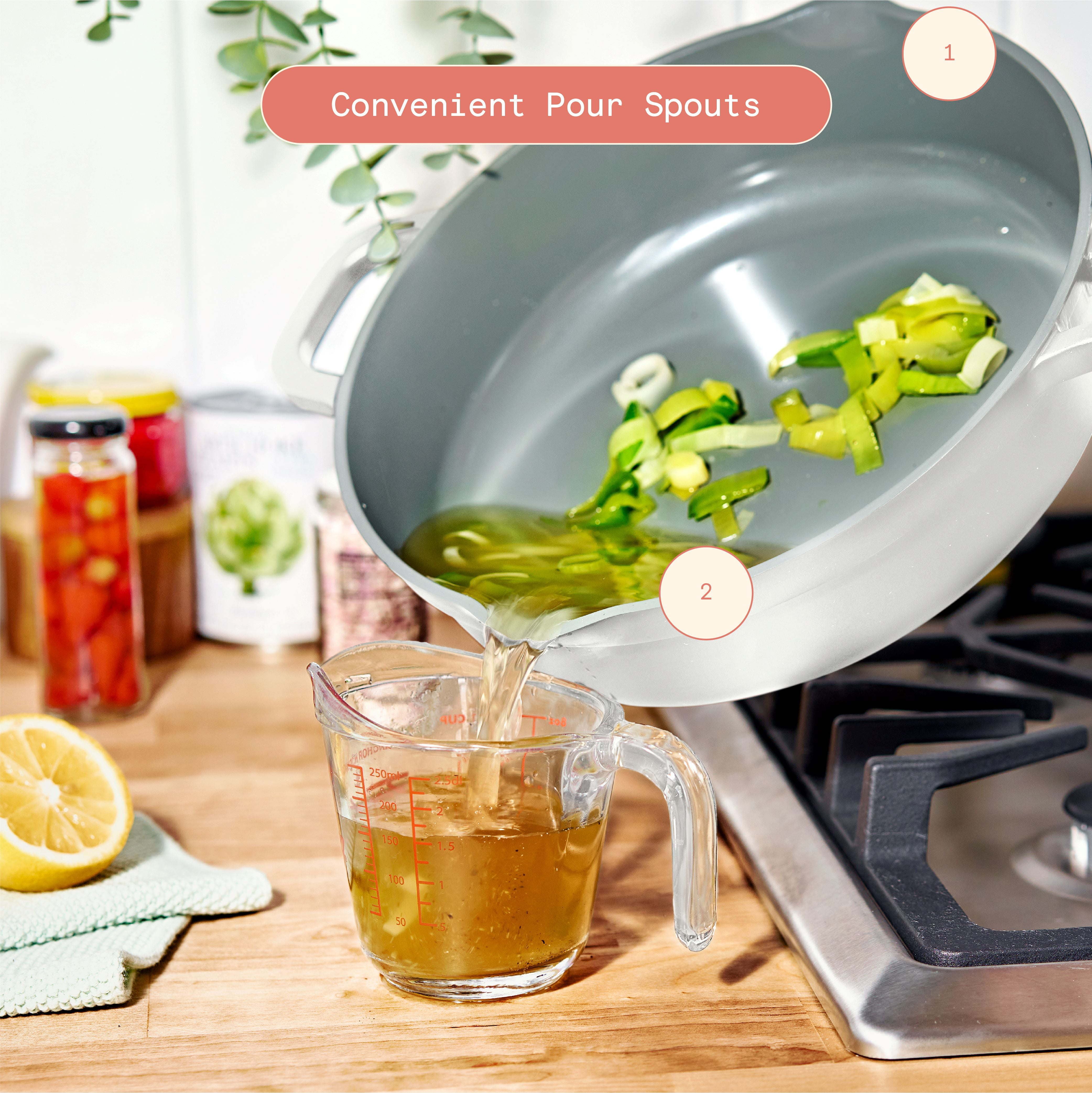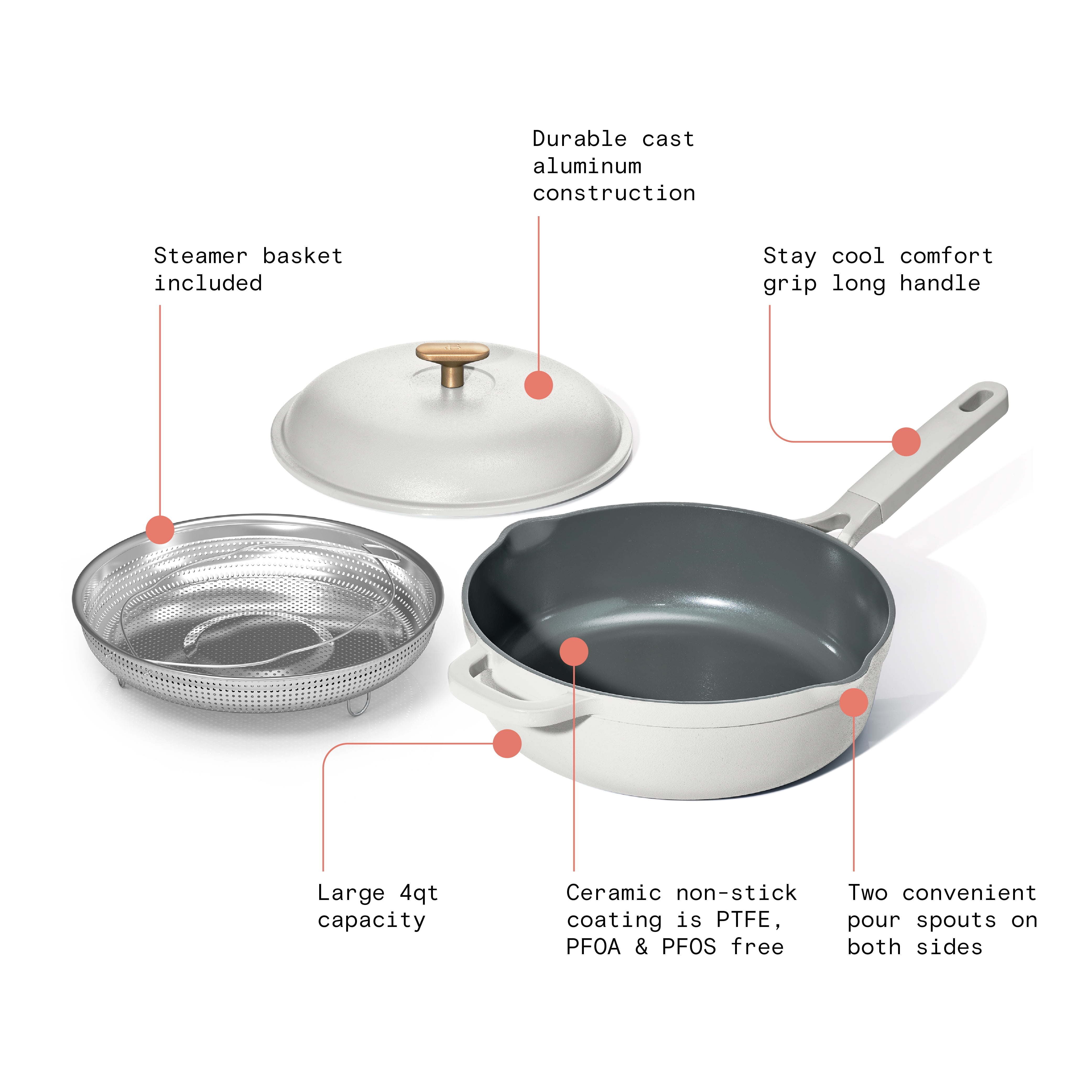 10 Cooking Functions: Boil, Strain, Sauté, Simmer, Pan Fry, Sear, Braise, Steam, Stir Fry, and Serve Free from forever chemicals, ceramic nonstick coating is PTFE, PFOA & PFOS free Durable cast aluminum construction 3 piece set, stainless steel steamer basket included Large 4qt capacity Two convenient pour spouts Compatible with all stovetops including induction Stainless lid knob with gold finish Stay cool comfort grip long handle Dishwasher safe, handwash recommended