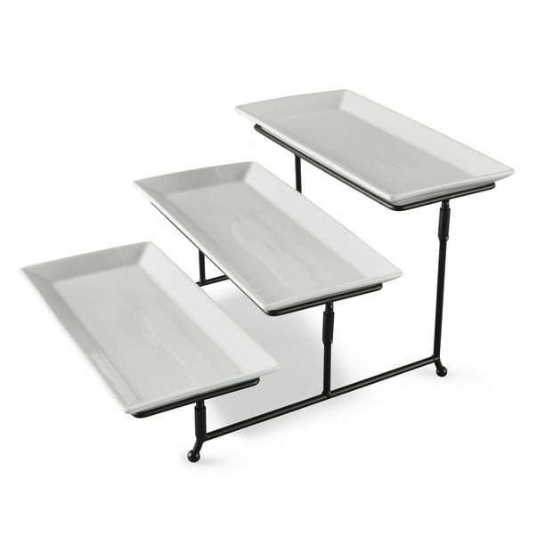 The Better Homes & Gardens 3 Tiered Server Set comes with 3 porcelain platters and a 5 pc metal stand that will break down for convenient storage. Use this 8 lb serve item assembled or use the platters separately for added versatility. Mix & match with other white porcelain dinnerware and serve items from Better Homes & Gardens. Item comes in a re-shipper for safety and does not ship in a gift box.
