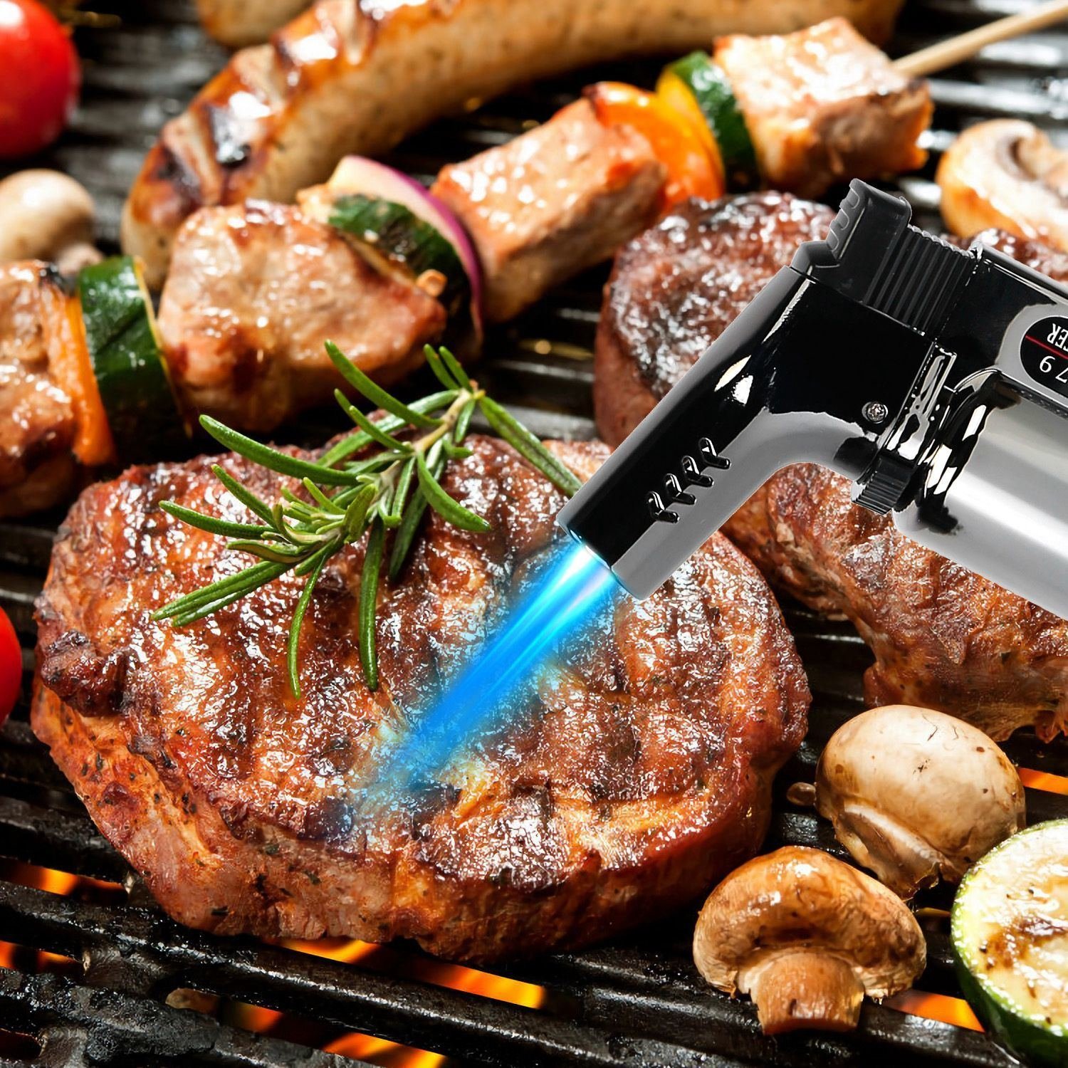 **Multi-purpose*:Excellent chef's kitchen cooking torch; can be used for caramelized food; glazed roast ham; grilled steak; roasted green pepper; melted cheese; toasted bread crumbs; outdoor grilling; etc. It is also very suitable for welding DIY jewelry; heat shrink Pipe; light the fireplace and cigar or use it as a survival tool.