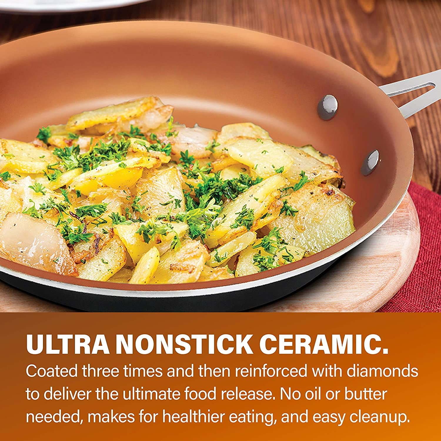 COOKWARE – with over 30 million happy customers, has revolutionized kitchens across the world with the introduction of the nonstick ceramic copper cookware! New for 2020, this set has been improved in every area including the nonstick coating, stay cool handles, exterior finish and durability, including adding diamonds to the surface to ensure the pan doesn't scratch! ULTRA NONSTICK – the nonstick cooking surface is coated 3x, reinforced with ceramic and titanium to deliver the ultimate food release. No oil or butter needed, makes for healthier eating, and provides for hassle free, 1-2-3 cleanup 12 PIECE COOKWARE SET – This set includes everything you need to outfit a kitchen including an 8.5' skillet, 10.5' frying pan with tempered glass lid, 5 quart stock pot with tempered glass lid, 1.5 quart sauce pan with tempered glass lid, 2.5 quart sauce pan with lid, XL aluminum steamer insert for 5 quart pot, bonus shallow square frying pan with tempered seal tight lid. DISHWASHER SAFE – spend less time with cleanup! After all the cooking and prepping is done, place cookware in the dishwasher for quick and easy cleanup. SUPER DURABLE – the coating of the pan is durable enough to withstand metal spatulas, spoons, whisks and more, while the aluminum exterior is dense, nonporous, and highly wear-resistant for long lasting performance