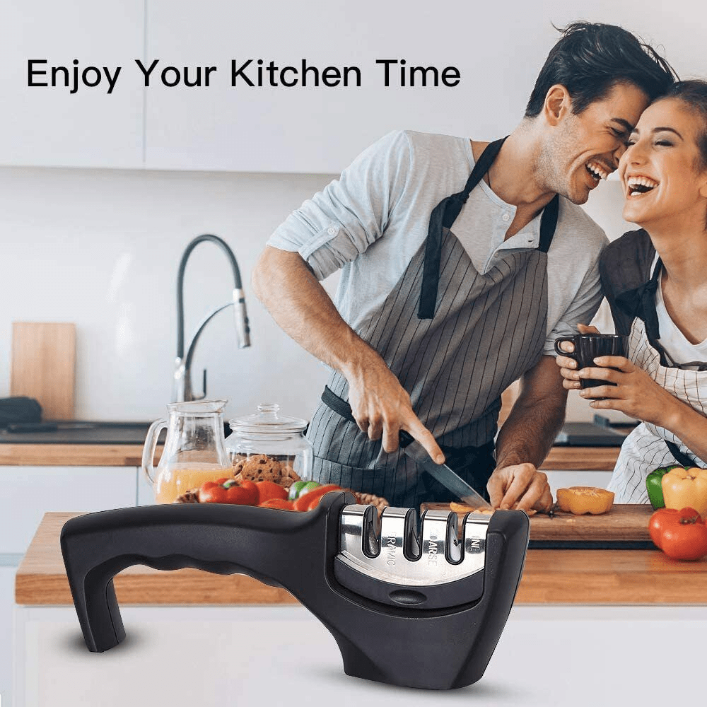 Professional Knife Sharpener by KT DealsFeatures The 3-Step Knife Sharpening kits are designed to sharpen any dull or damaged knives and blades. Stage 1: diamond sharpening rod repairs and straightens damaged blades. Stage 2: slot sharpens to restore its V-shape. stage 3 slot fine tunes for a final best polish. How Our Knife Sharpener Works: Stage 1 - Preparation (High grade Diamond rods). This 'roughens' the knife edge to prepare the surface for sharpening. It also smoothes any nicks and imperfections that could cause the blade to 'catch' during the sharpening stage (a common problem with 1 and 2 stage pull through sharpening slots which can cause damage to blades). Stage 2 - Sharpening (Hardened Tungsten Carbide Plates) - Now pull the blade through slot 2's precision angled tungsten carbide plates to create the perfect sharpened 'V' edge on even the bluntest knife. Stage 3 - Hone (Ceramic Stone Rods) - For final edge honing. It removes any burs and gently polishes the blade edges for a super sharp polish.