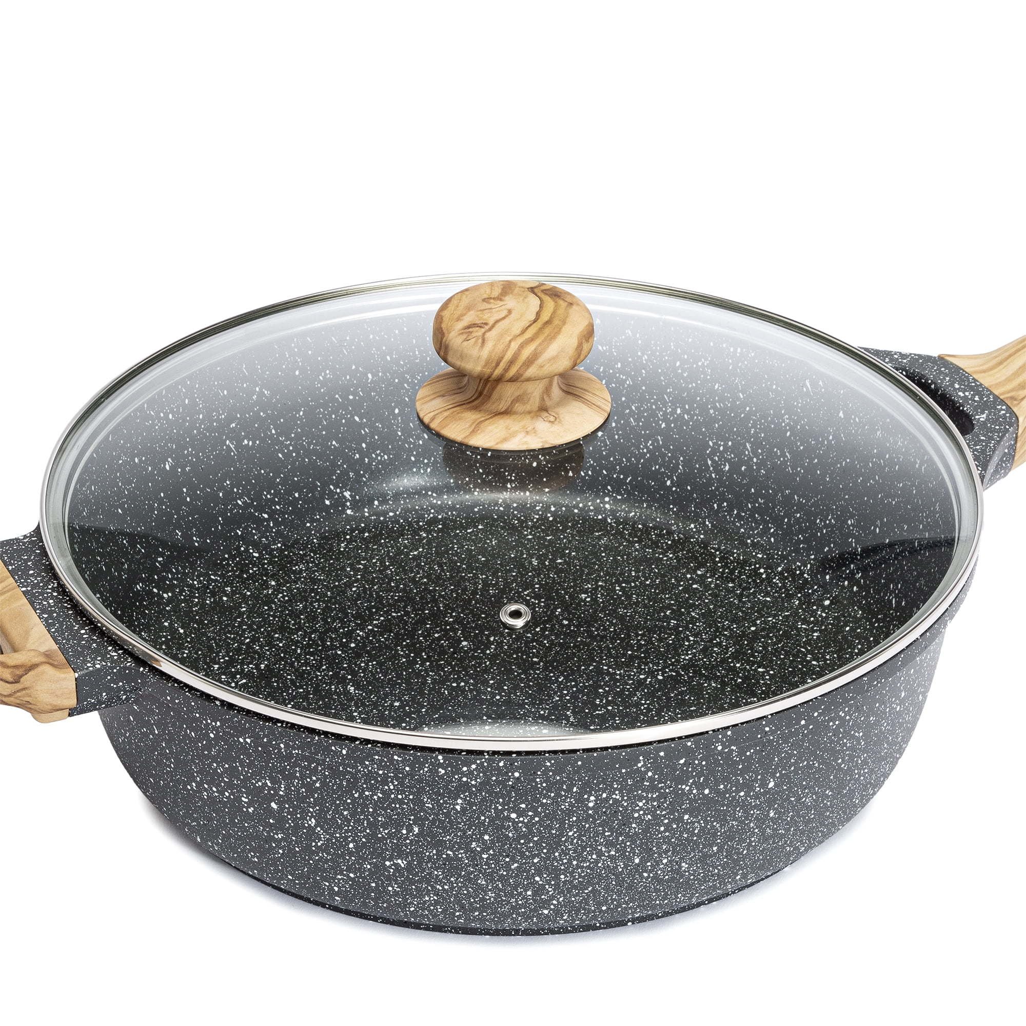 Lightweight cast aluminum jumbo cooker with glass lid Finished with gorgeous olivewood printed accents Dishwasher-safe for convenient care Non-stick coating for simplified cooking and cleaning Decorated with a vintage-inspired all-over speckle design Rapid and even heat distribution for quick heating and cooling