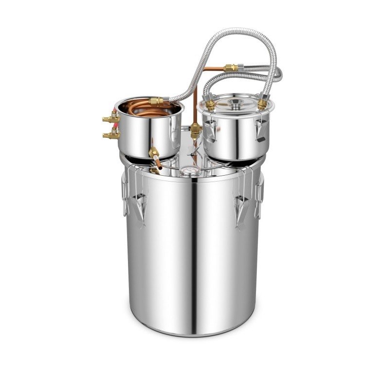 This 10 gL Stainless Steel distiller kit has a boiler pot, a thumper keg and a condenser, which is convenient for fermenting and distilling. Simply connect the bubble airlock and stopper and add water to half-fill the bubbling airlock. Has built-in thermometer on boiler pot, displays Fahrenheit and Celsius. The alcohol turns to vapor at about 173°F, while the water content in the fermented product turns to steam at 212°F. This 10 gal fermenter pot can also heat fermented results. It supports a variety of heating methods, including gas stove, induction cookers, electric ceramic stoves, coal stoves and firewood. Distill water, oil, or alcohol with ease. Please discard the first 4-7 oz of liquid as it comes out of the condenser distillate outlet. The thumper keg enables you to add more flavor to the distilled results. Apart from that, our condensing pot is designed with copper coil for fast cooling and an open top design to accelerate cooling. Please ensure a continuous source of cold water to the condenser pot. Made of food-grade stainless steel material, this multi-purpose distiller set is durable and safe.