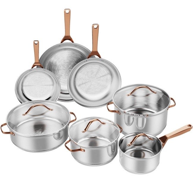11 Piece Stainless Steel Kitchen Cookware Set Gold Handles