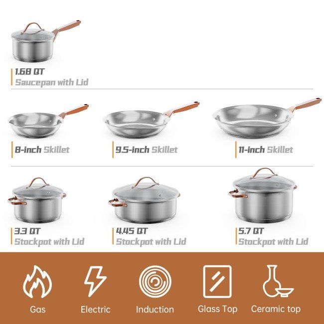 This 11 Piece Stainless Steel Kitchen Cookware Set Gold Handles perform all cooking tasks, large or small–simmer, sauté, fry, boil or braise. It includes a 1.7 QT saucepan with lid, a 3.3 QT stockpot with lid, a 5.7 QT stockpot with lid, a 4.5 QT stockpot with lid, an 8-inch skillet, a 9.5-inch skillet, and an 11-inch skillet. This set of cookware features a 3-ply base for fast and even heat induction and is adaptable to most of the cooking surface, gas, electric, induction or ceramic tops.