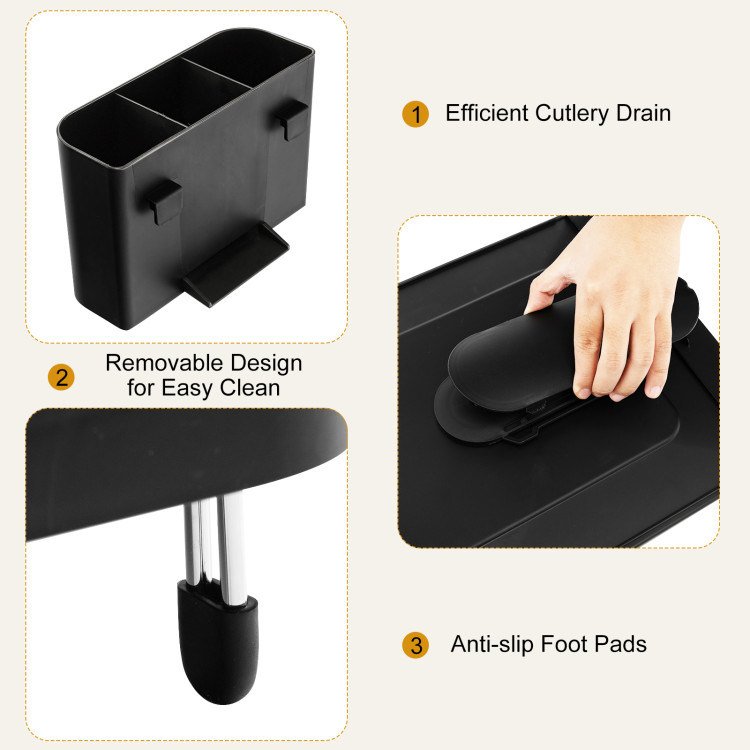 Perfect kitchen addition to hold different utensilsAutomatic drainage sends the water directly into the sinkSpout can be positioned on any side of the drainboardExpand to store more utensils and retract to save spaceCutlery holder is removableStainless steel frame ensures durabilityAnti-slip foot pads make the dish rack stand more evenly on the counterEasy to separate and clean all the parts