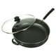 Generous capacity and cooking surface for preparing 1-pot meals and frying foods; Patterned gray interior nonstick coating for easy cooking and cleanup; Riveted, stay-cool handles; Heat- and shatter-resistant tempered glass lid allows easy monitoring of cooking progress; Compatible with electric, gas and ceramic glass cooktops; Dishwasher-safe; Model# 80119/557DS